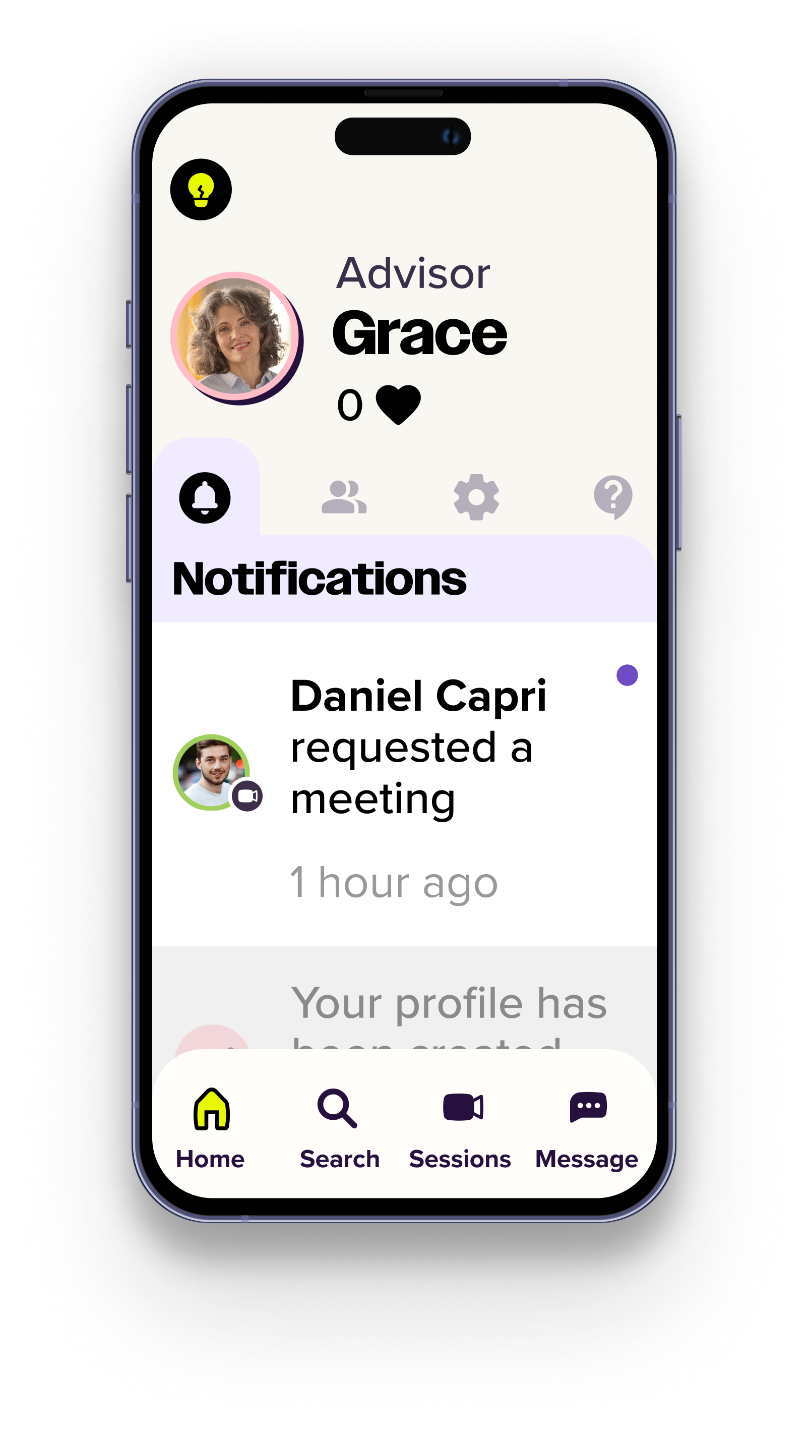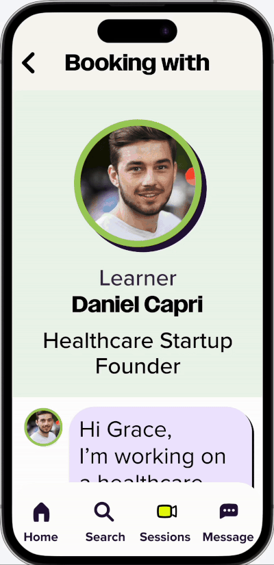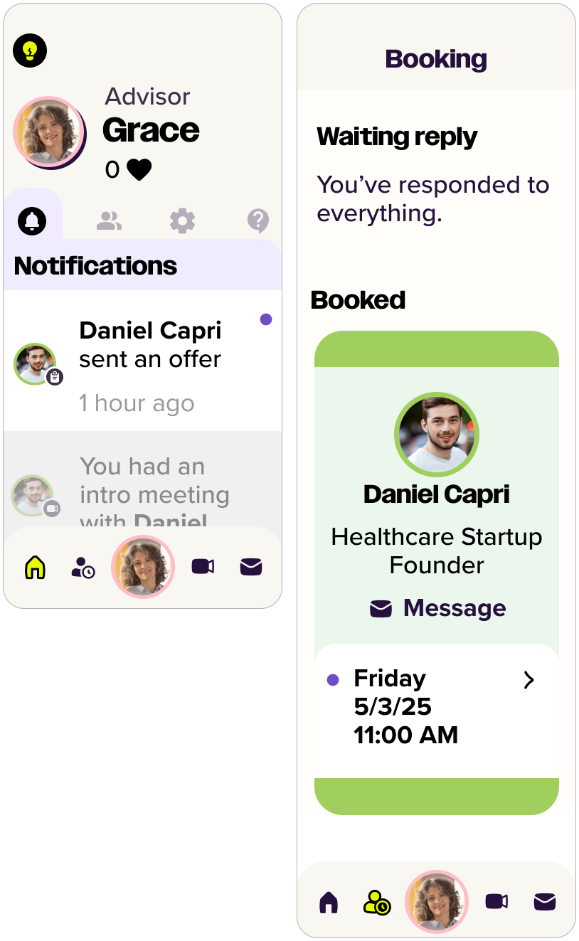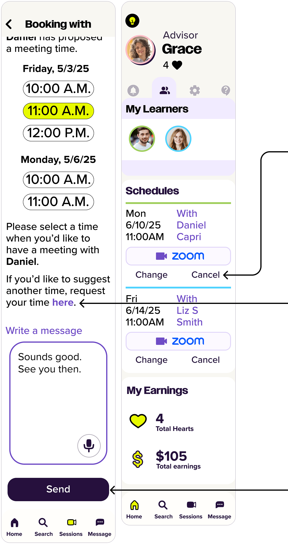 Booking a session feels as natural as sending a message. Instead of juggling apps or tools, Advisors and learners use one familiar thread to chat, suggest times, and confirm meetings. The flow is simple, intuitive, and designed so even those with limited technical skills - like many in the 60+ group - can feel confident and supported.