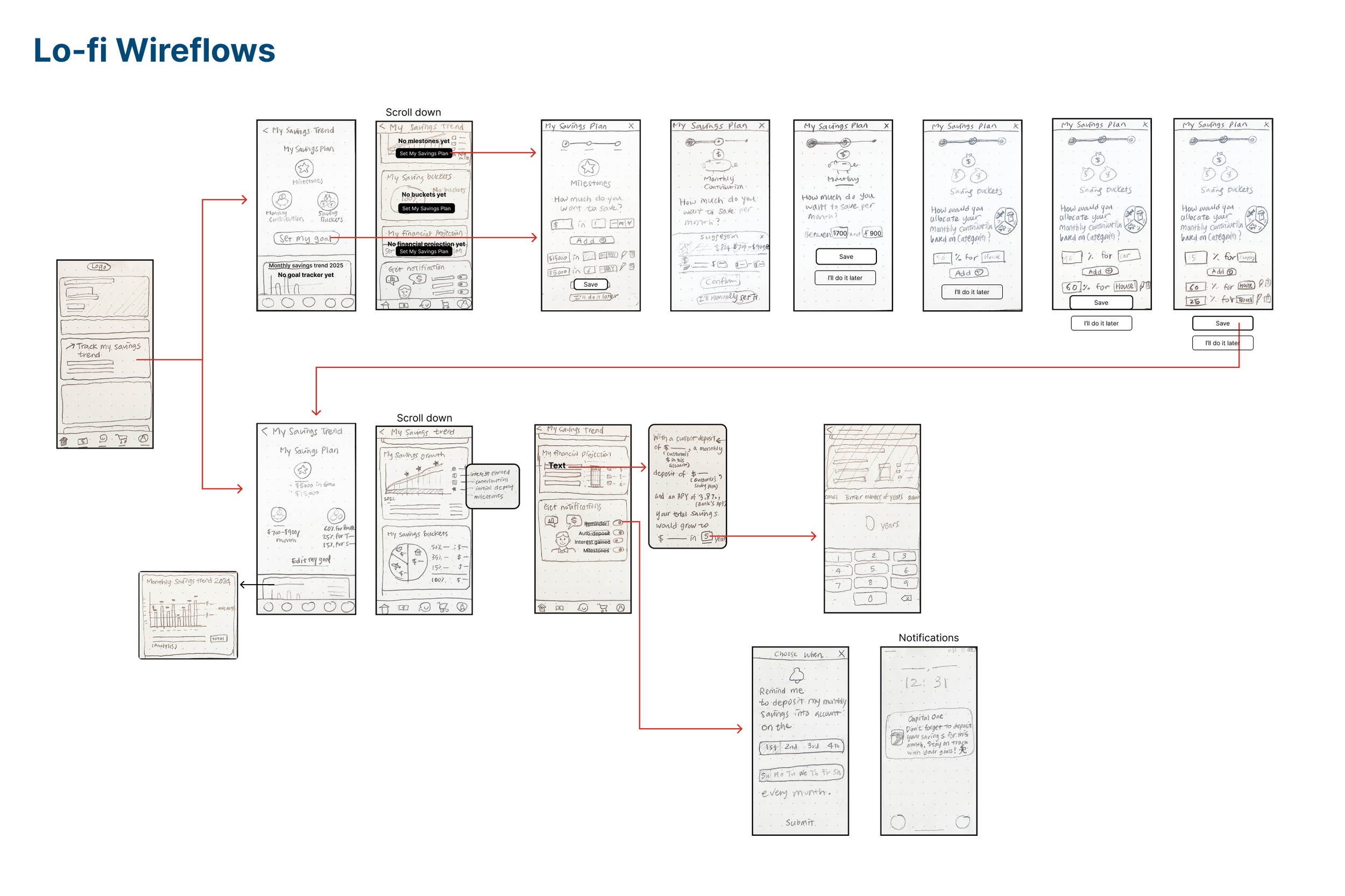These two research phases helped me clearly define the user problem: users want to feel more connected to their savings by seeing progress and organizing their goals, but existing banking tools are fragmented and require too much manual effort. This insight led directly to the development of the Savings Trend Tracker feature, combining automation, visualization, and goal-based savings in a single, seamless experience.