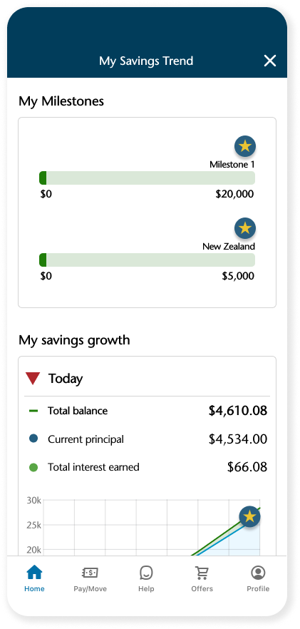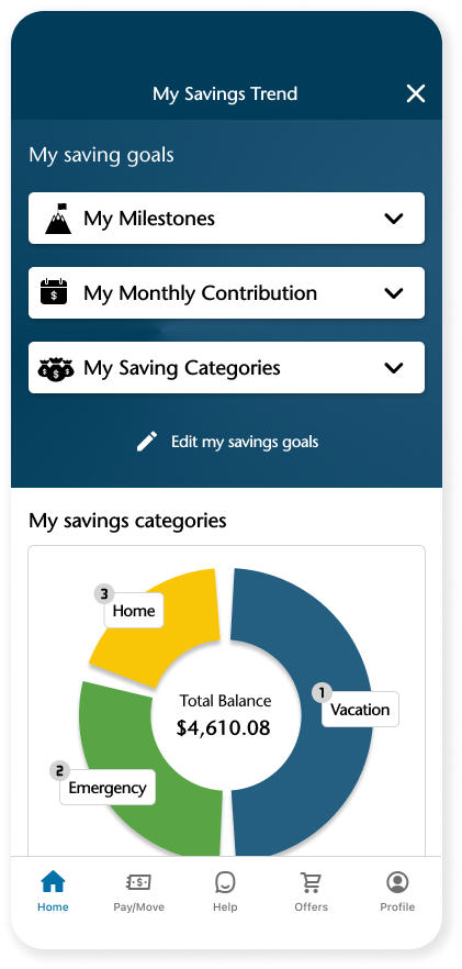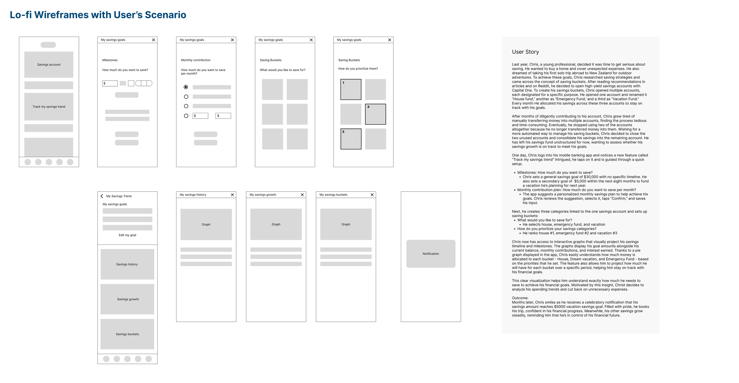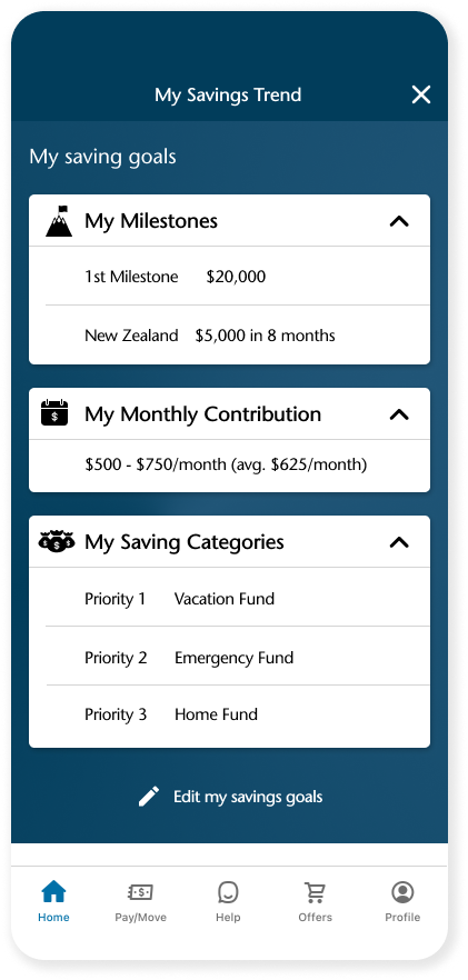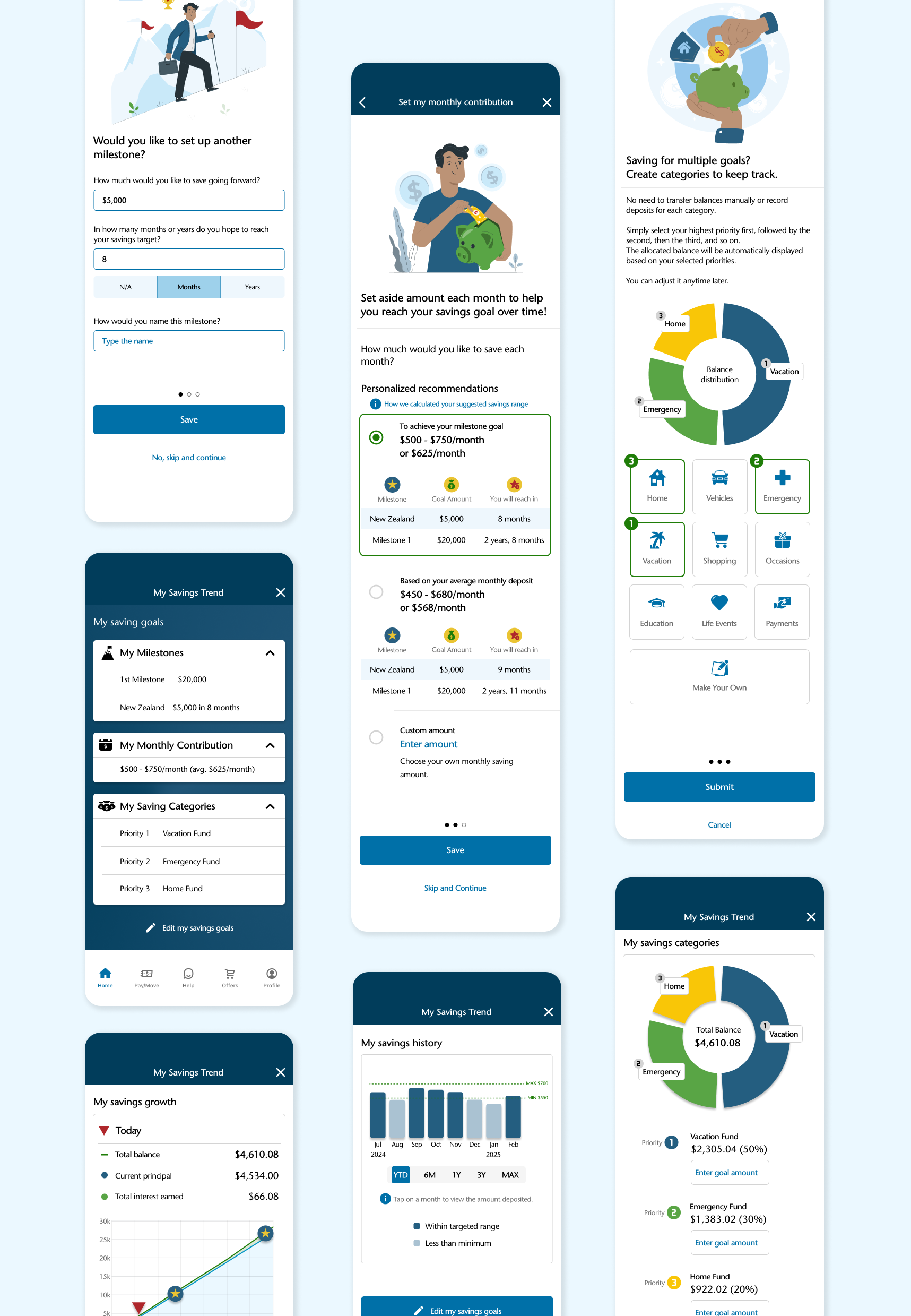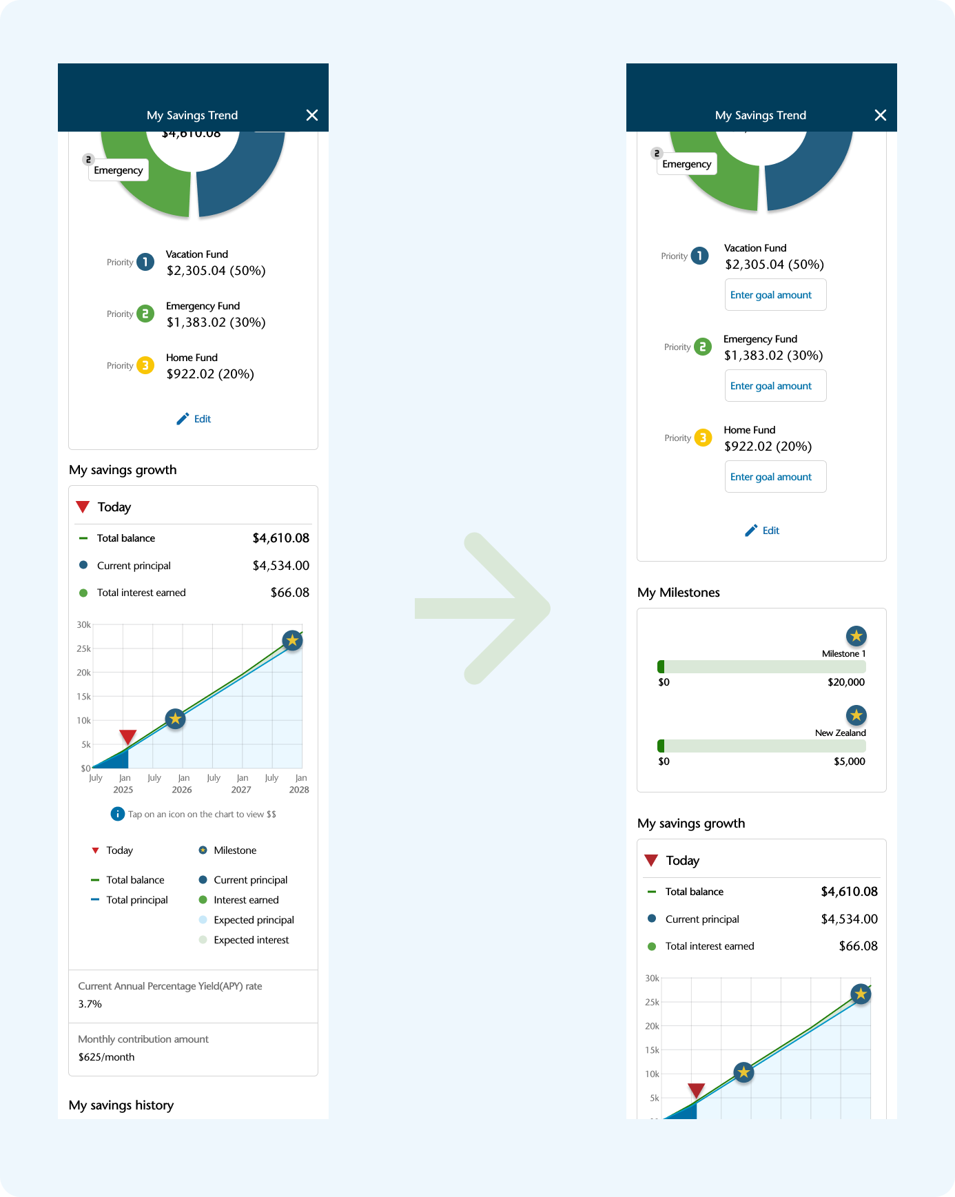 I developed a Savings Tracker feature that enables users to organize their savings into virtual buckets, set clear savings goals with simple steps, track interest earnings, and visualize their savings trends—creating a more engaging, intuitive, and personalized financial experience within a single account.