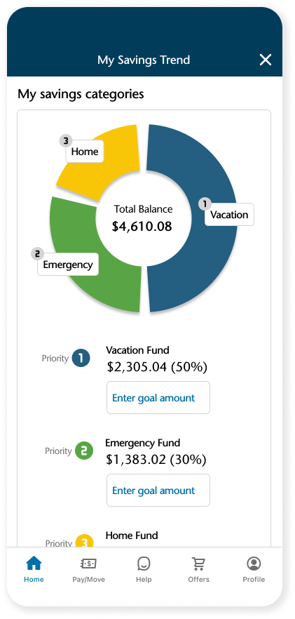 To meet this need, I introduced an automatic virtual bucket system within a single account, eliminating the need to open multiple savings accounts. Users simply set priorities for their savings categories (e.g., vacation, emergency fund, home), and the system automatically allocates funds using weighted percentages based on those priorities.
