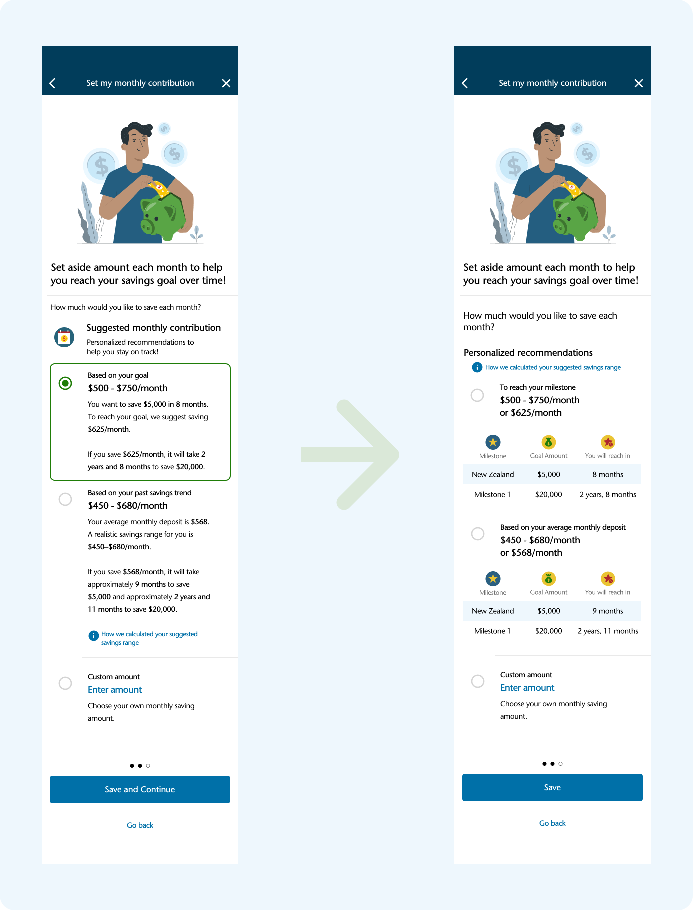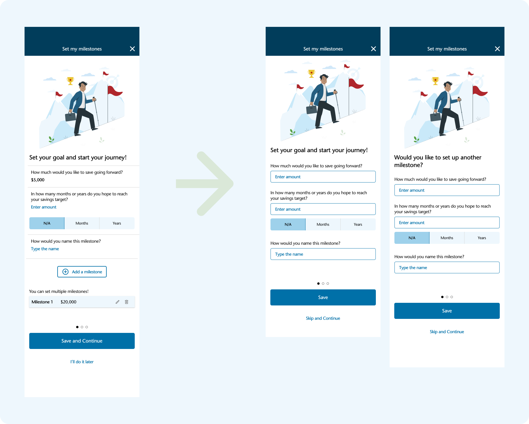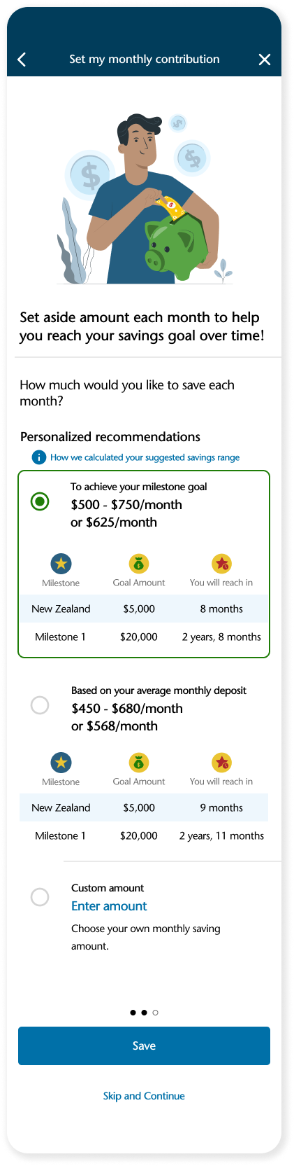 Set My Milestones – Users define the total amount they want to save, name their milestone, and set a target timeframe.