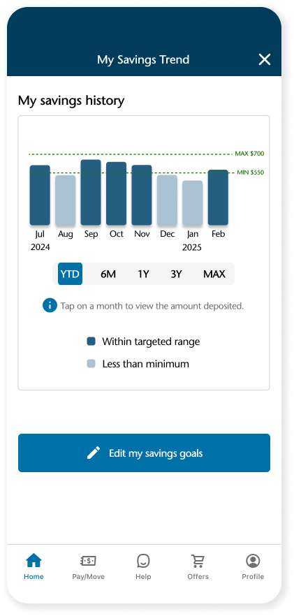 I designed an interactive savings history chart that clearly visualizes monthly deposit activity. This eliminates the need to manually review statements by providing data-driven insights in an easy-to-understand, engaging format. By making savings behavior more transparent, users can effortlessly track their financial habits, stay motivated, and make more informed financial decisions.
