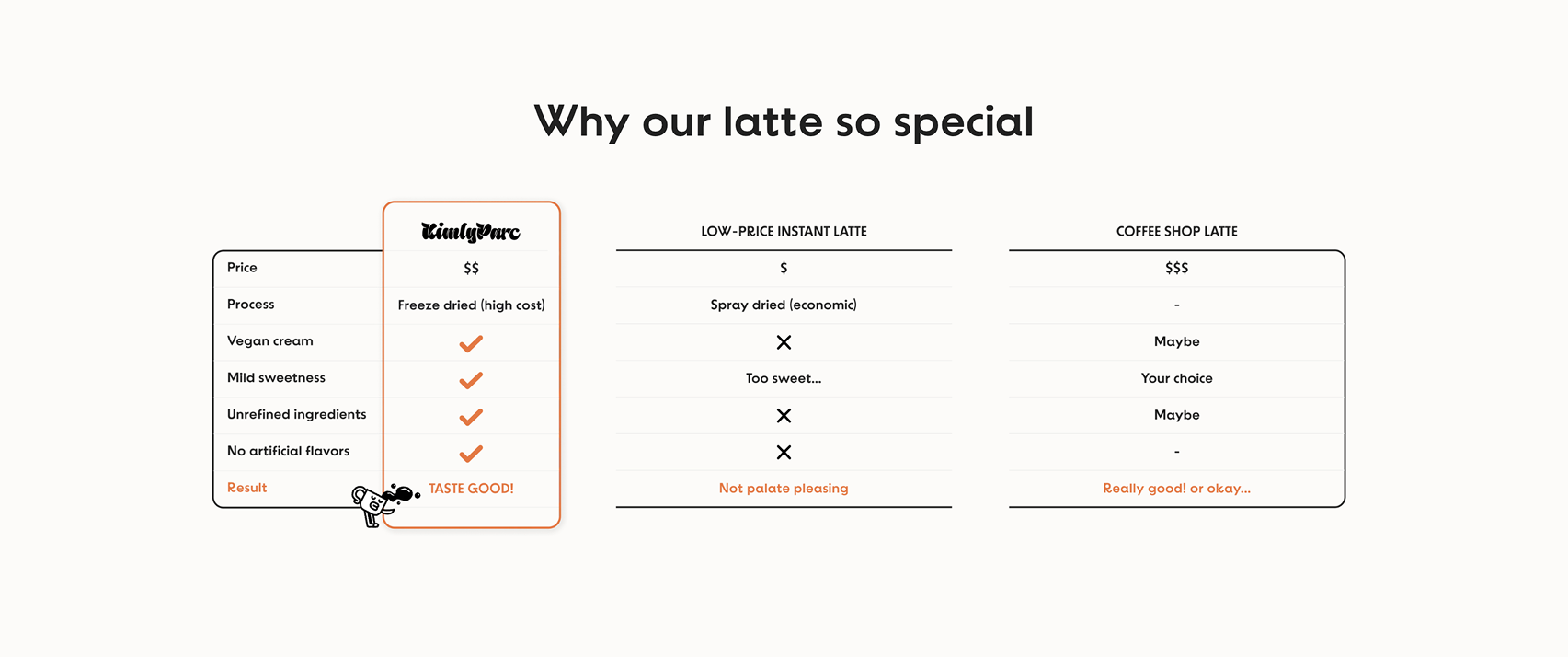 I removed the competitive chart from the latte page since the ingredient infographic already delivered the same message. By cutting redundancy, the page became cleaner and easier to navigate.