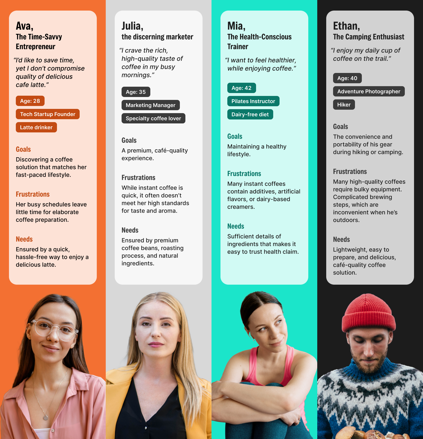 From research and analysis, I identified KimlyParc’s strengths in premium, heritage-inspired instant coffee and uncovered user desires for health, culture, and trust. The client further emphasized positioning the brand as health-conscious, tasty, and convenient. Bringing together these insights with market analysis and client input, I defined four user personas that capture key problems, goals, and motivations.