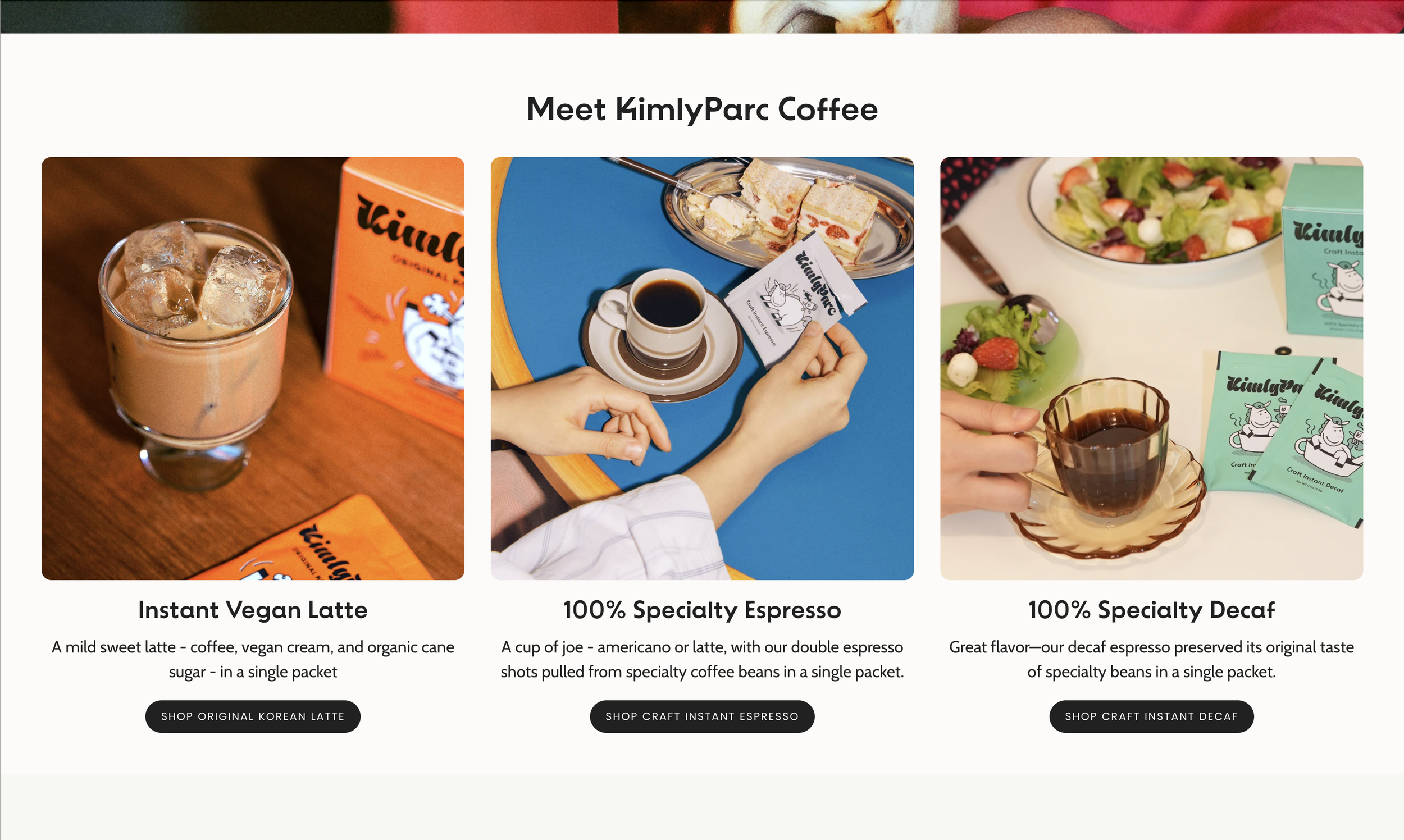 KimlyParc is a premium instant coffee brand rooted in Korean coffee culture. The original website lacked clear storytelling, product differentiation, and intuitive navigation, making it hard for users to understand the brand’s value.