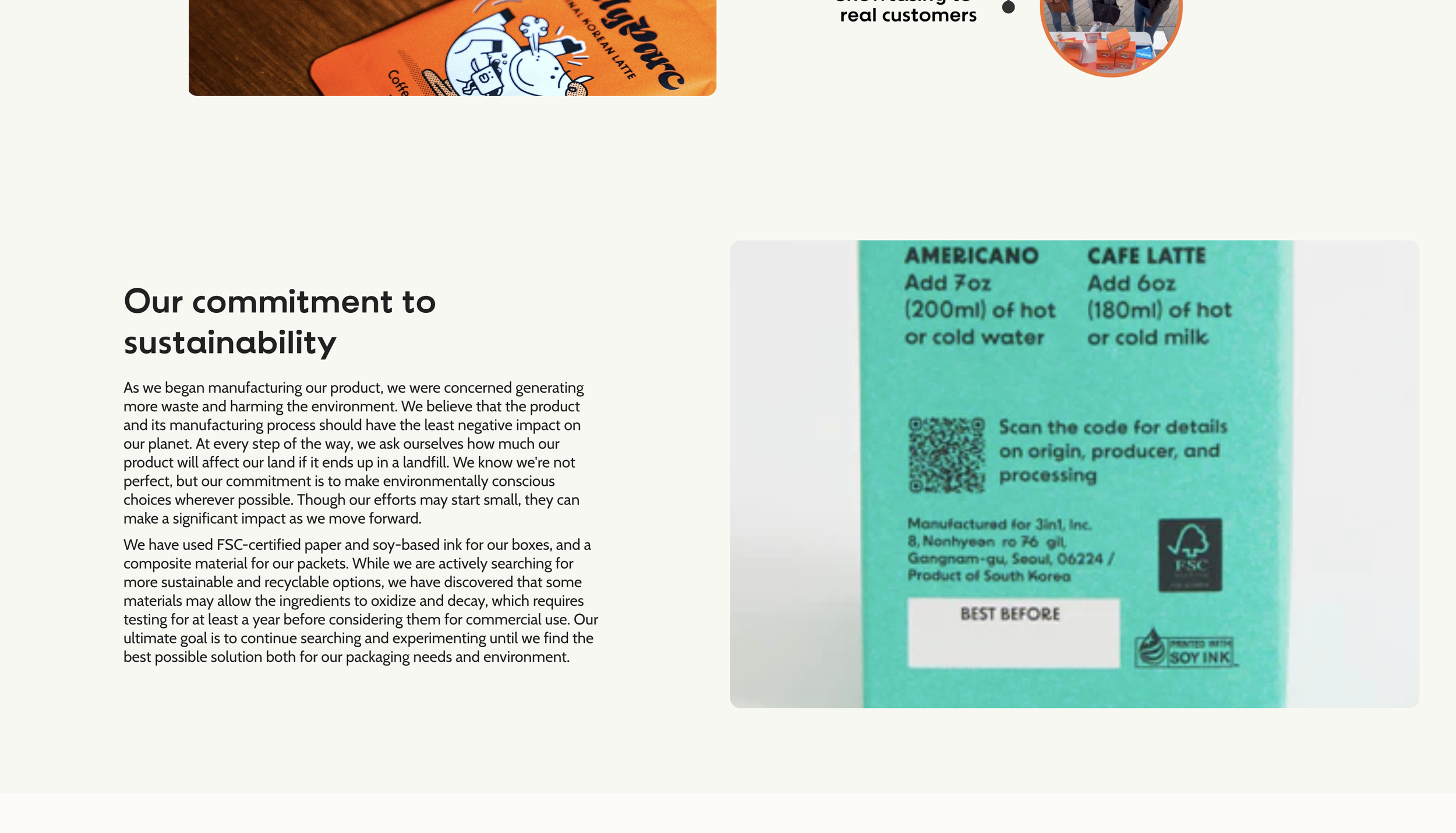 This product page highlights the latte’s rich taste, premium, natural vegan ingredients, and easy preparation. Visually engaging version of comparison infographics positions the product favorably against other instant options. To emphasize authenticity, the page also links to the story behind Korea’s iconic “mix coffee,” now reimagined as a clean, modern beverage.