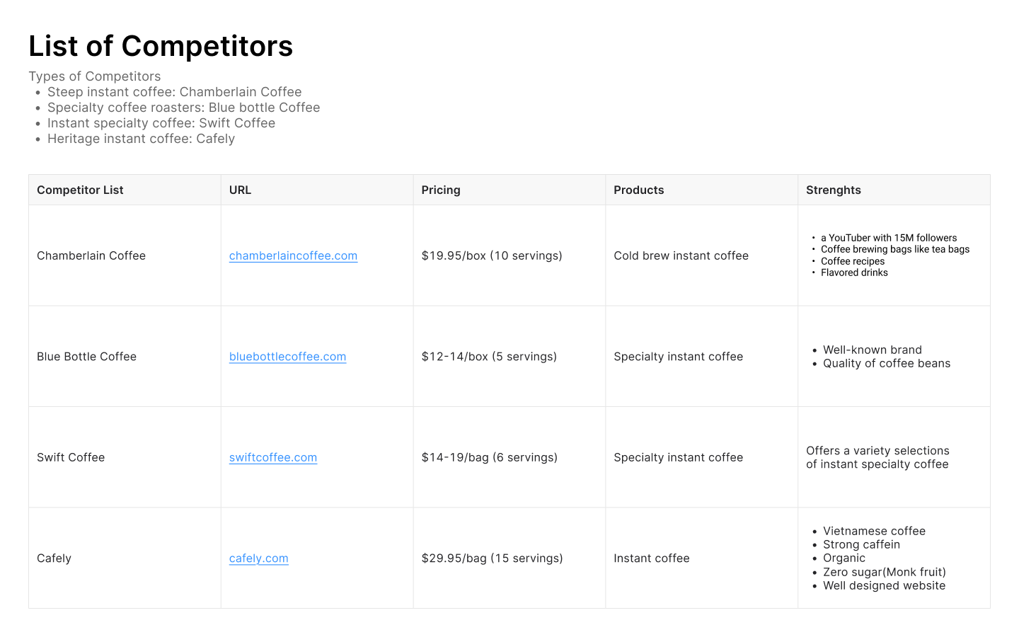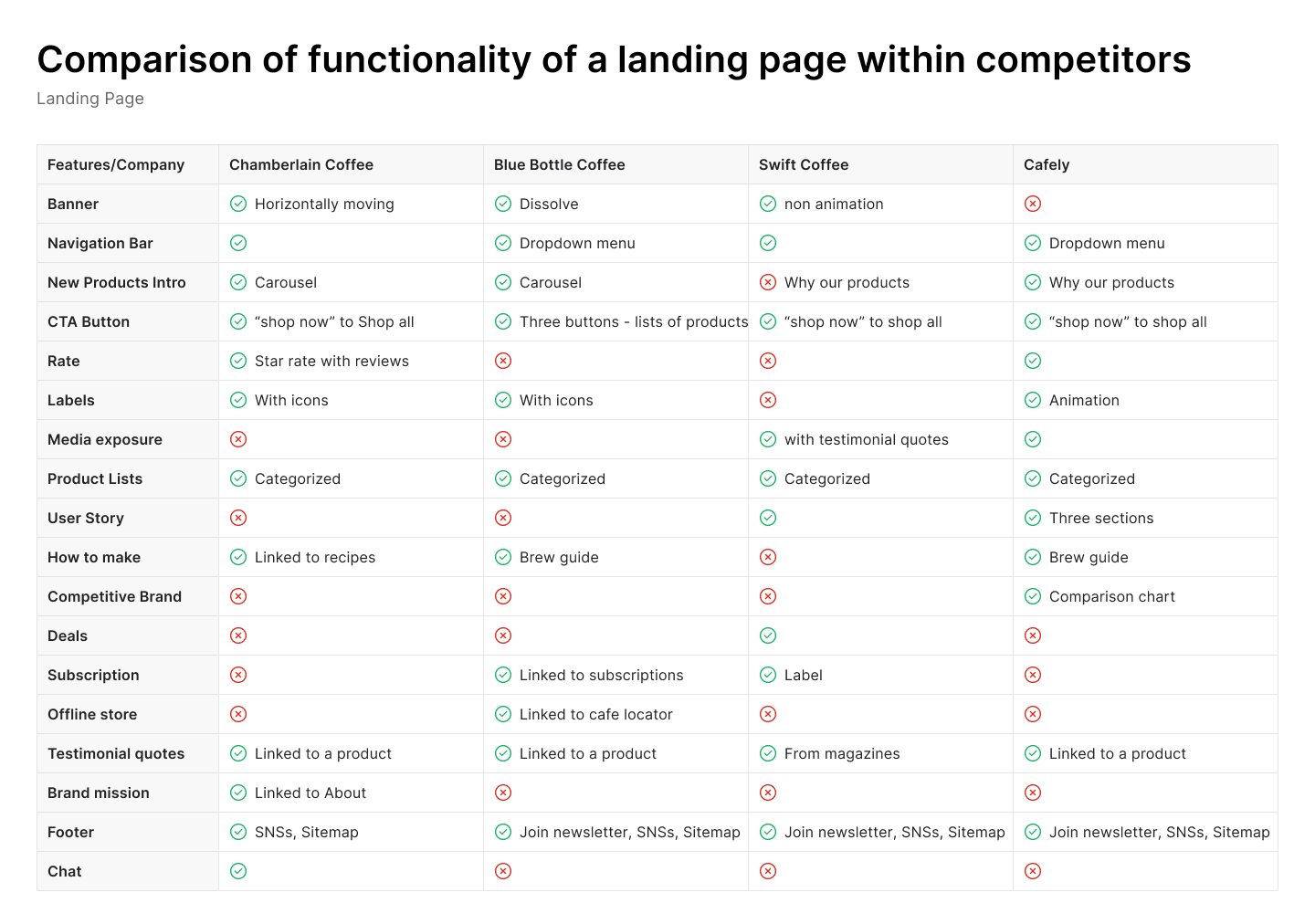 I analyzed leading competitors in the specialty and instant coffee space—such as Chamberlain, Blue Bottle, Swift, and heritage-inspired brands like Cafely—to identify trends, value propositions, and gaps in product storytelling, visual presentation, and user experience.
