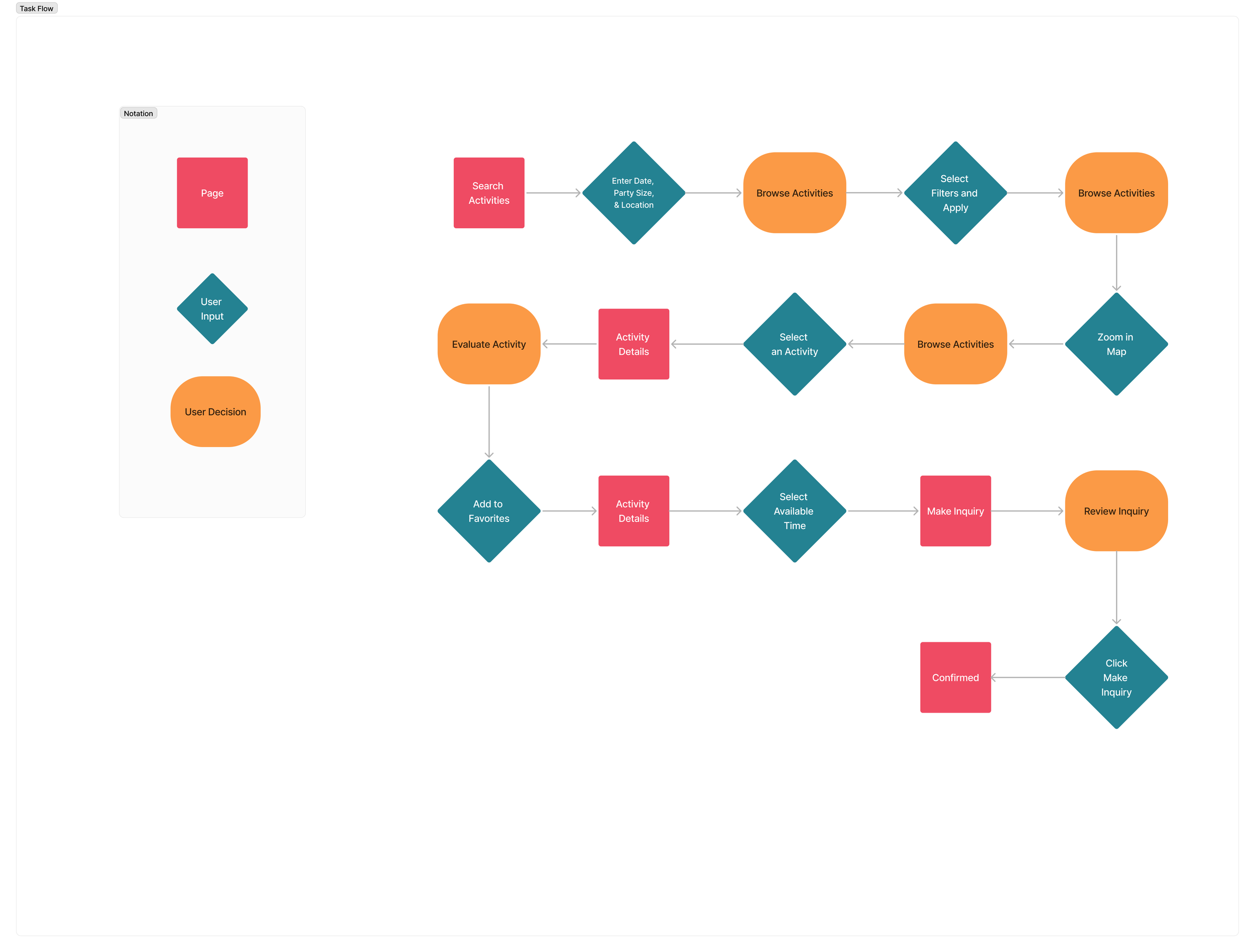I started by creating a task flow to ensure a simple and intuitive booking process, allowing users to narrow down their search by date, location, budget, and filters, leading seamlessly to a booking. Based on this flow, I developed a user persona’s story to illustrate how a parent would interact with the product. Finally, I translated these insights into a wire flow with low-fidelity wireframes, mapping out key screens and interactions to create a smooth and user-friendly experience.