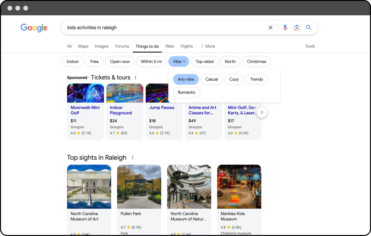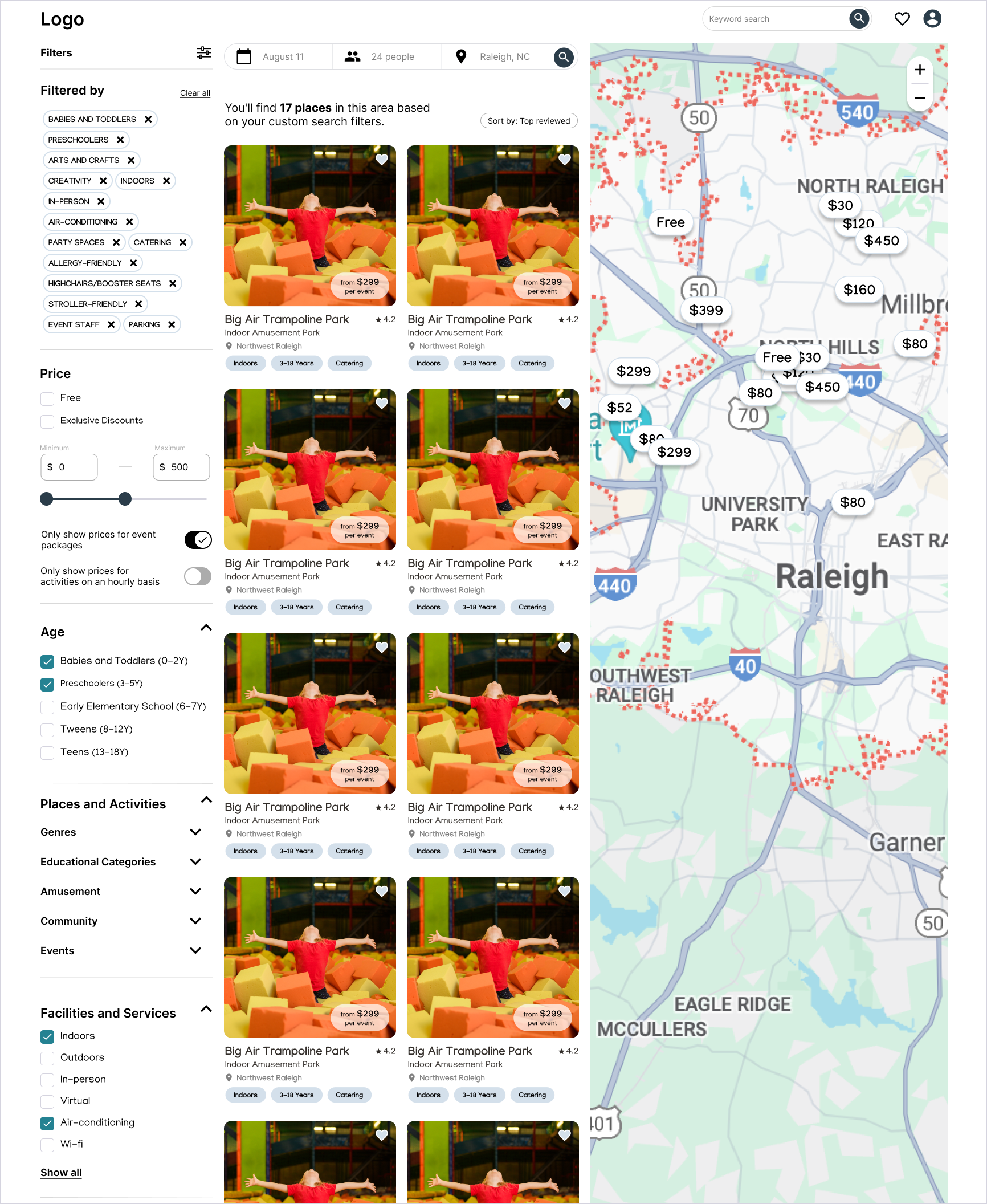 Kids' activities, events, and venues are highly diverse and complex, making tree navigation an inefficient way to organize the information. Google Search allows users to sort by distance, rating, indoor activities, and free options. However, while its filtering system is user-friendly, it is also very limited—too general and not designed with family-friendly filters. As a result, it does not provide a customized search experience for users.